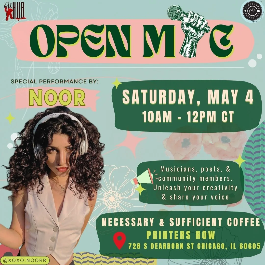 Discover new talent and be inspired at necessary & sufficient coffee x Al Hub's Open Mic! Join us for a cup of coffee, community, and creativity at Necessary & Sufficient Coffee in Printers Row on May 4th from 10am - 12pm CT. Sign-up begins at 10am*